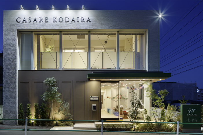 外観はスリットによるボリュームの分割で組み立て、 幅広のアプローチとガラス面でエントランスの 視認性を高めました。 内装は木のぬくもりに包まれた 優しい空間がコンセプトです。 今までの邸宅風・無難な設えではなく あえてショップライクなギャラリーをご提案しました。