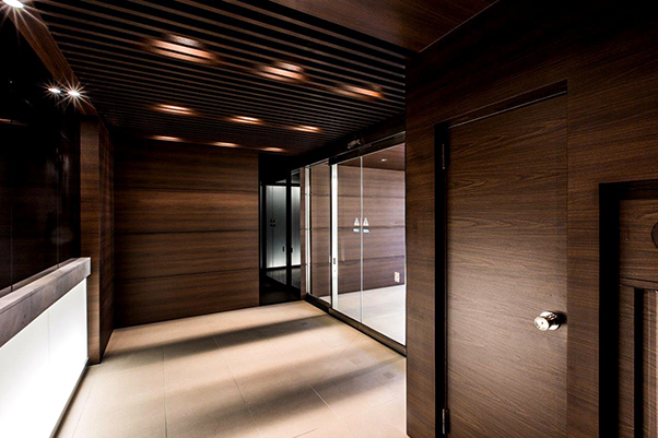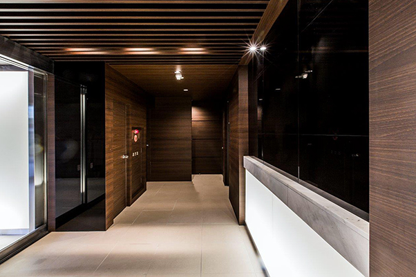 築30年を越えるビルの改修工事。 既存の風格あるスクラッチタイルとなじみを良くするため、黒とウォルナットの素材でメリハリをつけ、大きく印象を変えることが出来た。 また、エントランスが北面に面し、暗い印象があったため光壁を新設。来場者を光で導き、明るく気品あるエントランスが生まれた。