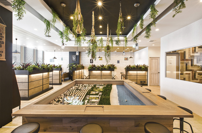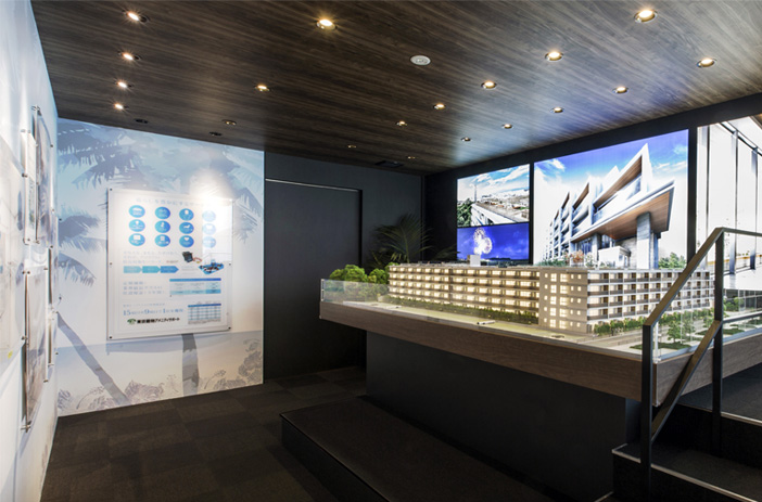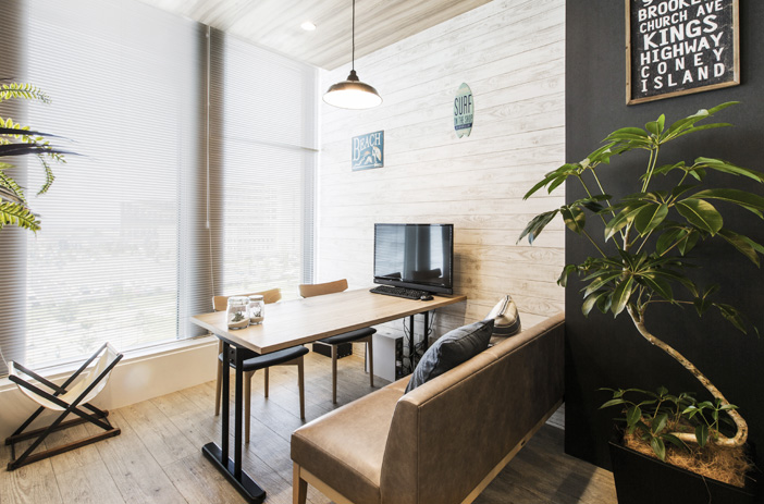 大規模公園と浜辺に近接した物件の持つ「心地良さ」「開放感」をオマージュし、わかりやすく表現しました。 ビーチサイドに佇むカフェのように。 適度な視線の抜けに気を配り、各スペースを統一したコンセプトでつなげることにより、全体を通して一体感が生まれ、ストレスフリーのゲストサロンが生まれました。 来場者の想像を高めるお手伝いを存分に発揮し、次の言葉にふさわしい空間であることを願います。 人生を、海と共に。