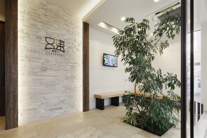 本体マンションの『雑木林のイメージ』をマンションギャラリーにも 取り入れたいというお客様からのご要望で 狭いながらも素敵な植栽で雰囲気を出している物件です。