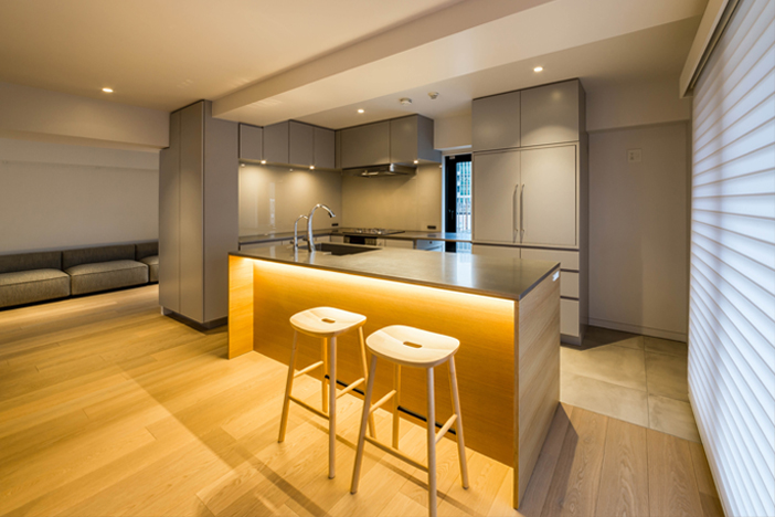本計画は1989年竣工マンションのリノベーション計画であった。 弊社では占有部の内装、そして各住設(キッチン、洗面、収納など)をデザイン監修を受け施工致しました。 ミリ単位で調整されるディテールから間取りやカラーコーディネートのバリエーションに富んだ計画の中、住まう方の個性を表出した住空間の提供をお手伝いすることとなった。 株式会社近代建築社 平成29年3月5日発行 書籍「近代建築」vol.71 2017年3月号掲載